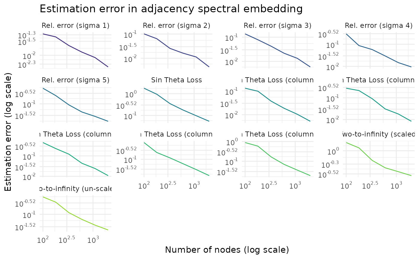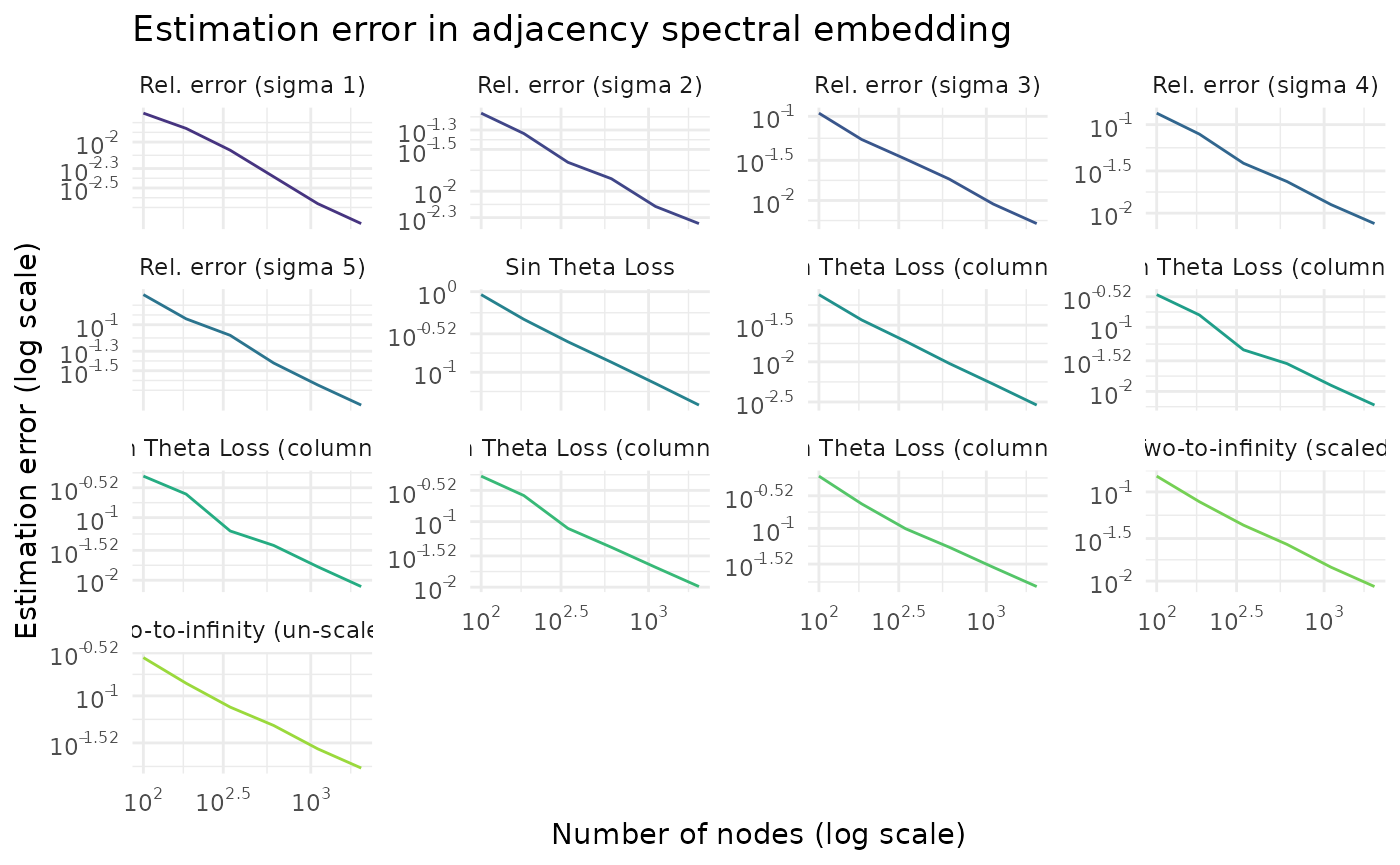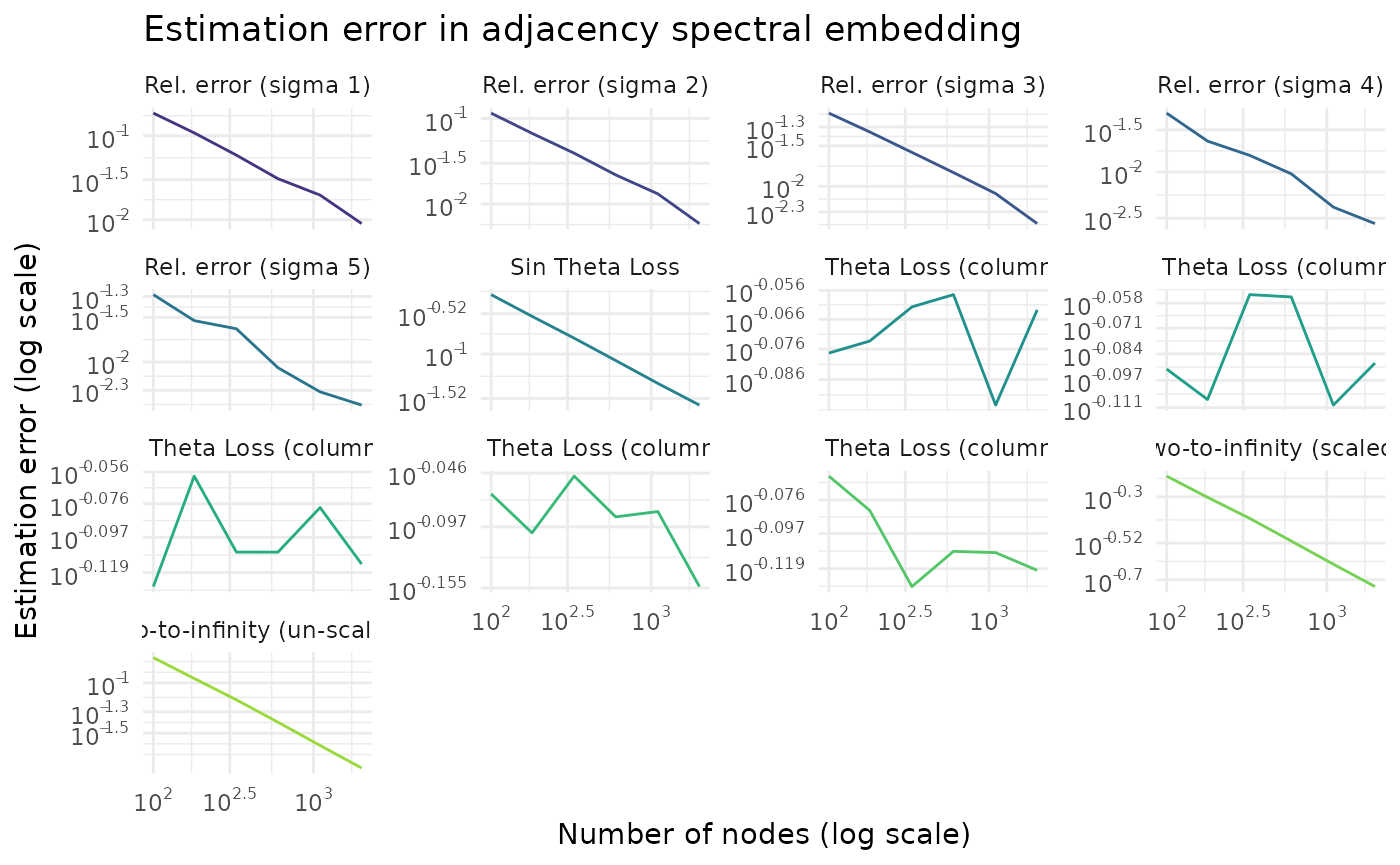 In our earlier simulations, we only look at relative error in recovering the spectrum. This is because (1) the spectrum is changing as a function of sample size, so we want to stabilize it somehow when we think about convergence, but (2) absolute errors might be growing with sample size. In random dot product graphs, we have theoretical results stating that