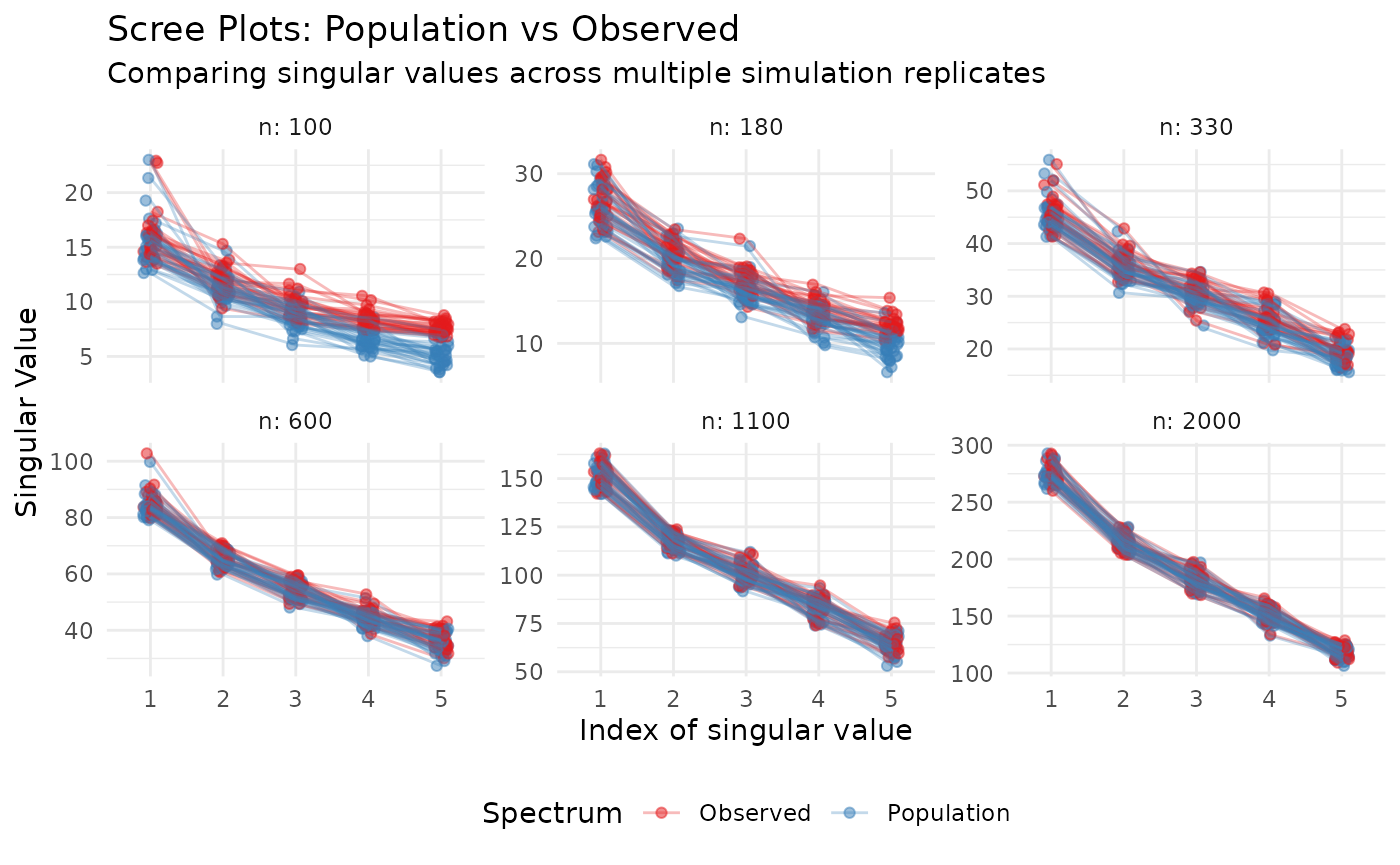 subtitle = "Comparing singular values across multiple simulation replicates",